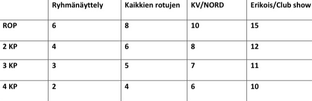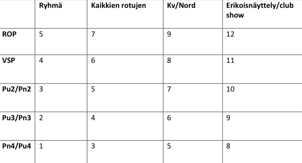 | Veteraani * kilpailee veteraaniluokassa * 6 parasta tulosta huomioidaan * omistaja on Shih Tzu r.y.;n jäsen * lisäpisteitä tulee veteraaniluokkaan osallistuneiden rodun edustajien lukumäärän mukainen määrä (esim. 5 veteraania paikalla = 5 lisäpistettä) * pisteet lasketaan veteraaniluokan sijoitusten mukaan * pisteitä saavat vain ERI&SA:lla palkitut * pisteiden mennessä tasan, voittaa ko.vuoden aikana pisteensä vähemmillä näyttelyillä kerännyt. Lisäpisteet BIS-Vet1 = 4p. BIS-Vet2 = 3p. BIS-Vet3 = 2p. BIS-Vet 4 = 1p. | Pistetaulukko ![]() |