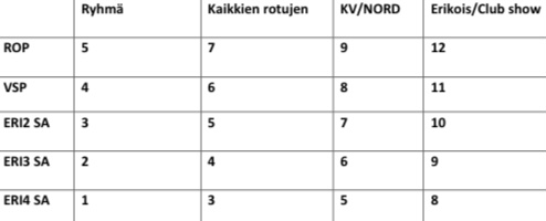 | Sija | Nimi | kl1 | kl2 | kl3 | kl4 | kl5 | kl6 | kasvattien pisteet yht. | Pisteet yht. |