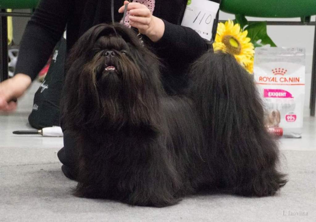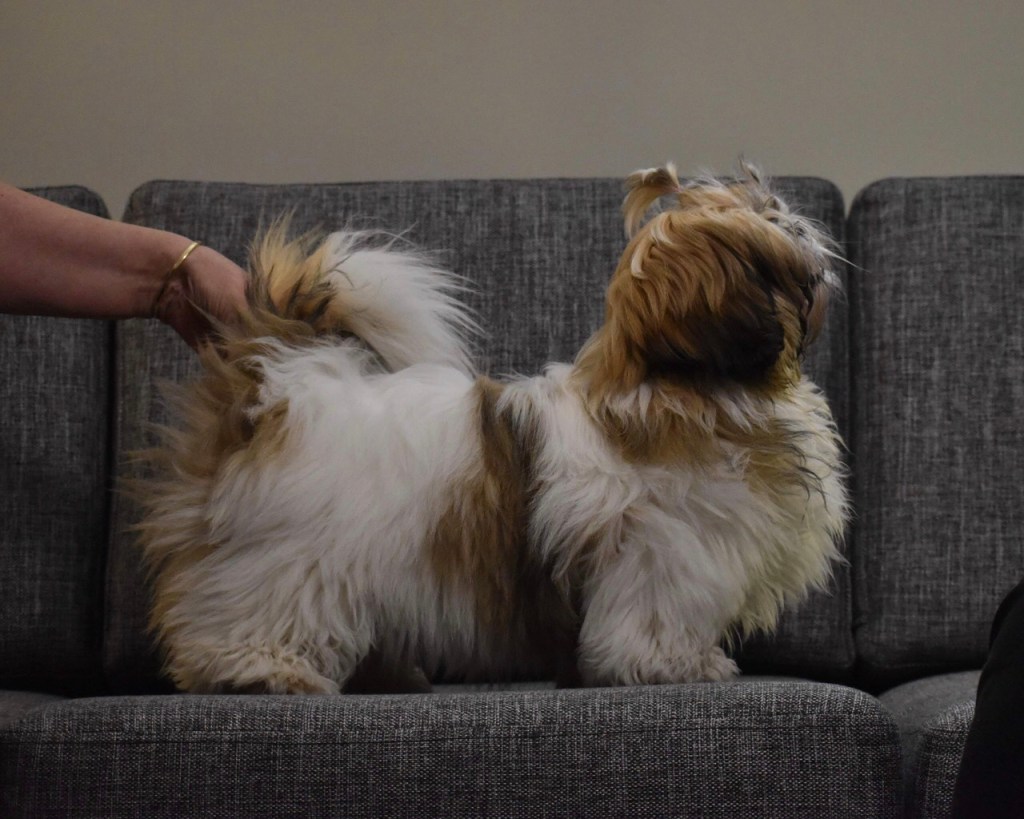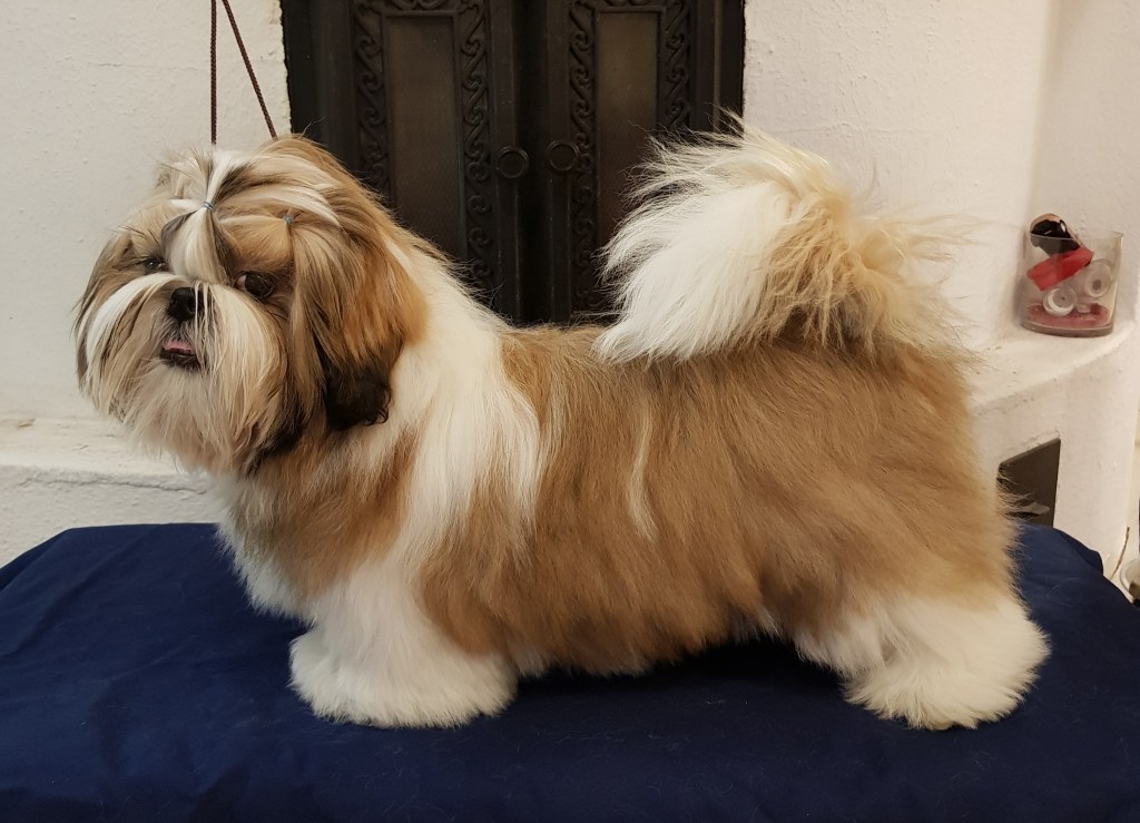 critique: G/w feminine bitch, not standing relaxed so the top line in not shown correctly – but she is of correct breed type and has lovely round head and seems to be full of Shih Tzu temperament. The coat is beautiful.