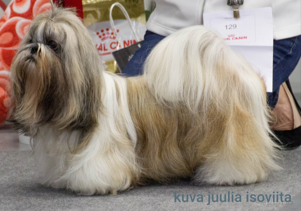 critique: Solid gold masculine dog, close to everything I love to see in a Shih Tzu, excellent breed type, well balanced top line with high tail. Broad head, wide set, full, dark & round eyes with aloof expression. Broad muzzle, open nostrils and correct chin. Beautiful coat. (Reminds me of the Finnish Shih Tzu in the 1990’s)